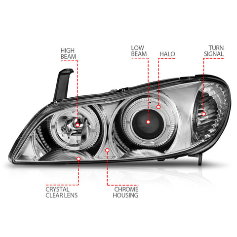 Projector Headlight Set, w/Halo, Clear Lens, Chrome Housing, Pair, . Guaranteed To Improve Your Vehicles Appearance. Rigorously Tested For Fit And Function. Simple Plug And Play. No Modifications Required. Easy Installation Using Common Hand Tools. Uses Stock Mounting Locations And Hardware. D.O.T. Compliant To S.A.E. Standards. Sold As A Pair. Does Not Fit Models With Factory HID Bulbs.