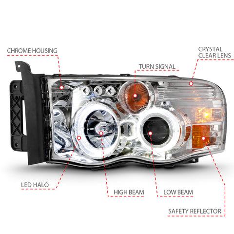 Projector Headlight Set, w/Halo, Clear/Amber Lens, Chrome Housing, Pair. Guaranteed To Improve Your Vehicles Appearance. Rigorously Tested For Fit And Function. Simple Plug And Play. No Modifications Required. Easy Installation Using Common Hand Tools. Uses Stock Mounting Locations And Hardware. D.O.T. Compliant To S.A.E. Standards. Sold As A Pair.